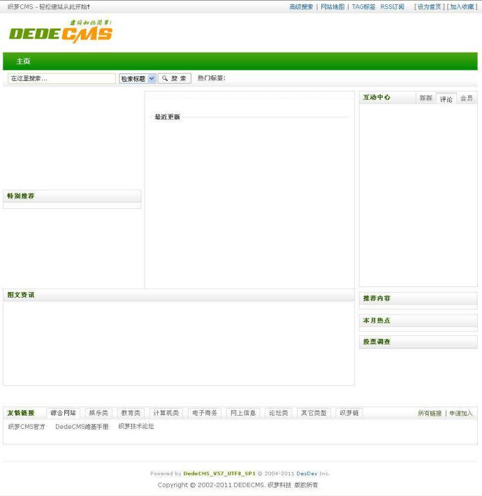 织梦的安装如果想进前台看界面的话可以直接在输入网址的地方输入:localhost/50或者点击右上角的网站主页,同样能跳转到主页,这里的主页是织梦的页面,下次给大家讲一下怎么使用自己的页面作为网站主页。附织梦默认主页让大家看一下。