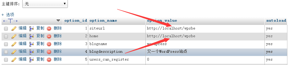 3、打开这个表,找到第一条记录,也就是option_name为siteurl的那条记录,将option_value中错误的地址改为正确的即可。(如果option_name为home的那条记录地址也是错误的,改为正确的即可)